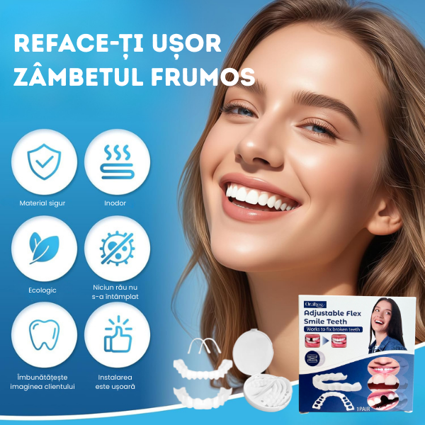SMILEFIT PRO este creat pentru cei care își doresc un zâmbet impecabil fără proceduri costisitoare. Sistemul maschează petele, spațiile libere și dinții lipsă în câteva secunde.